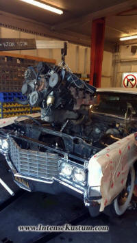 Out comes the stock Cadillac engine |