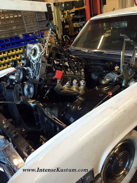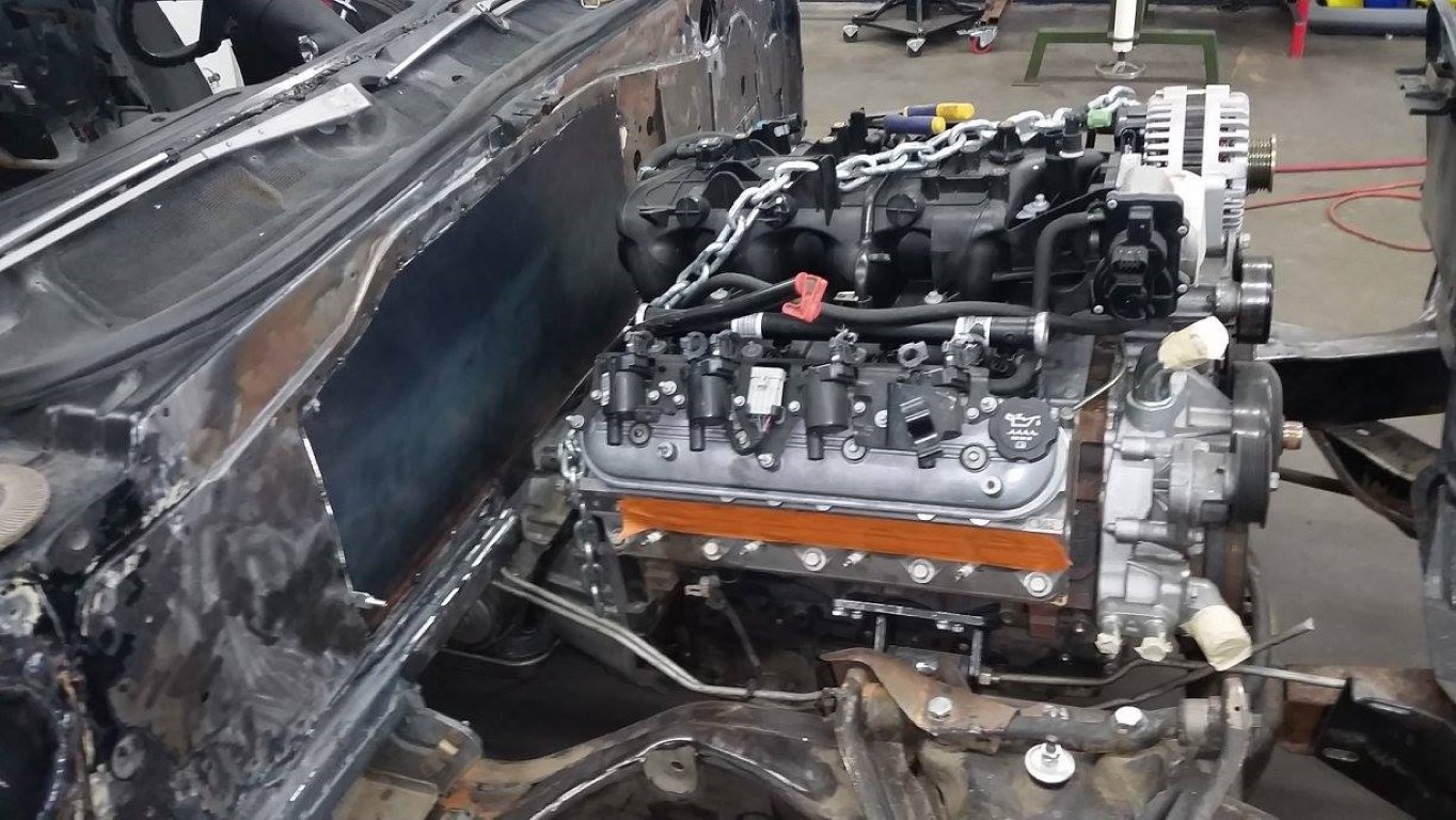 Dropping the LS engine and transmission into the Caddy |